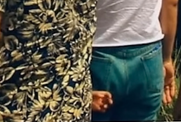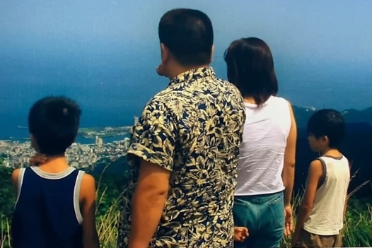 男性と女性の間に小さな手のようなものが映り込んでいる。