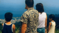 沖縄の洞窟(ガマ)で撮影されたという写真。右側の女性の右肩に黒い手のようものが写り込んでいる。