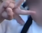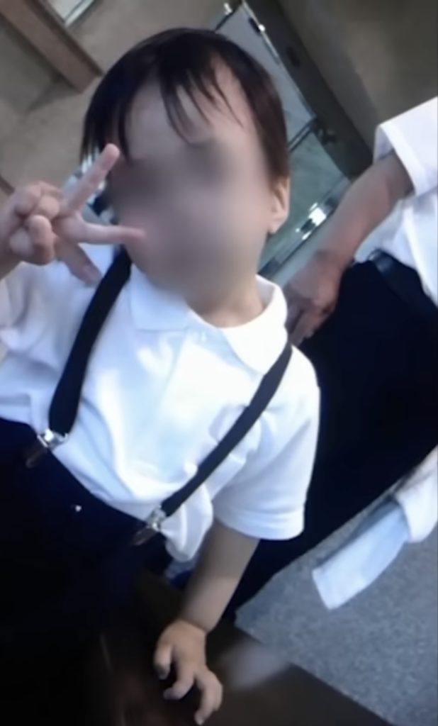 ピースする被写体の子供の右肩から親指のようなものが写り込んでいる。